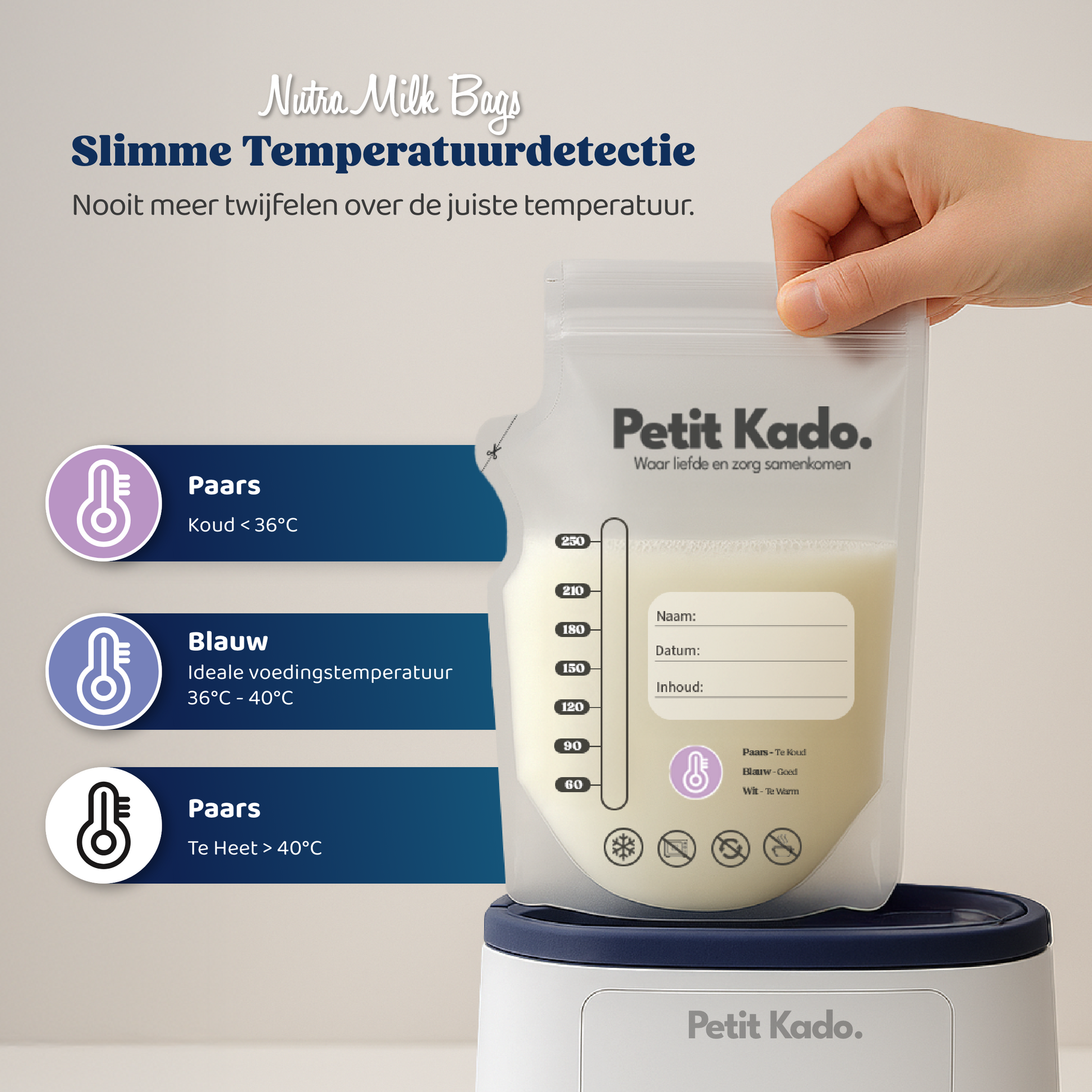 De waterkom is warm. Maar is je melk nu té warm, of nog net te koud? Geen gespetter, geen gokken. De ingebouwde temperatuurindicator op het zakje zegt het je zó: Paars = koud, Blauw = perfect, Wit = oppassen. Het is alsof het zakje met je meedenkt. Geen verbrande lipjes, geen extra check, gewoon zekerheid.